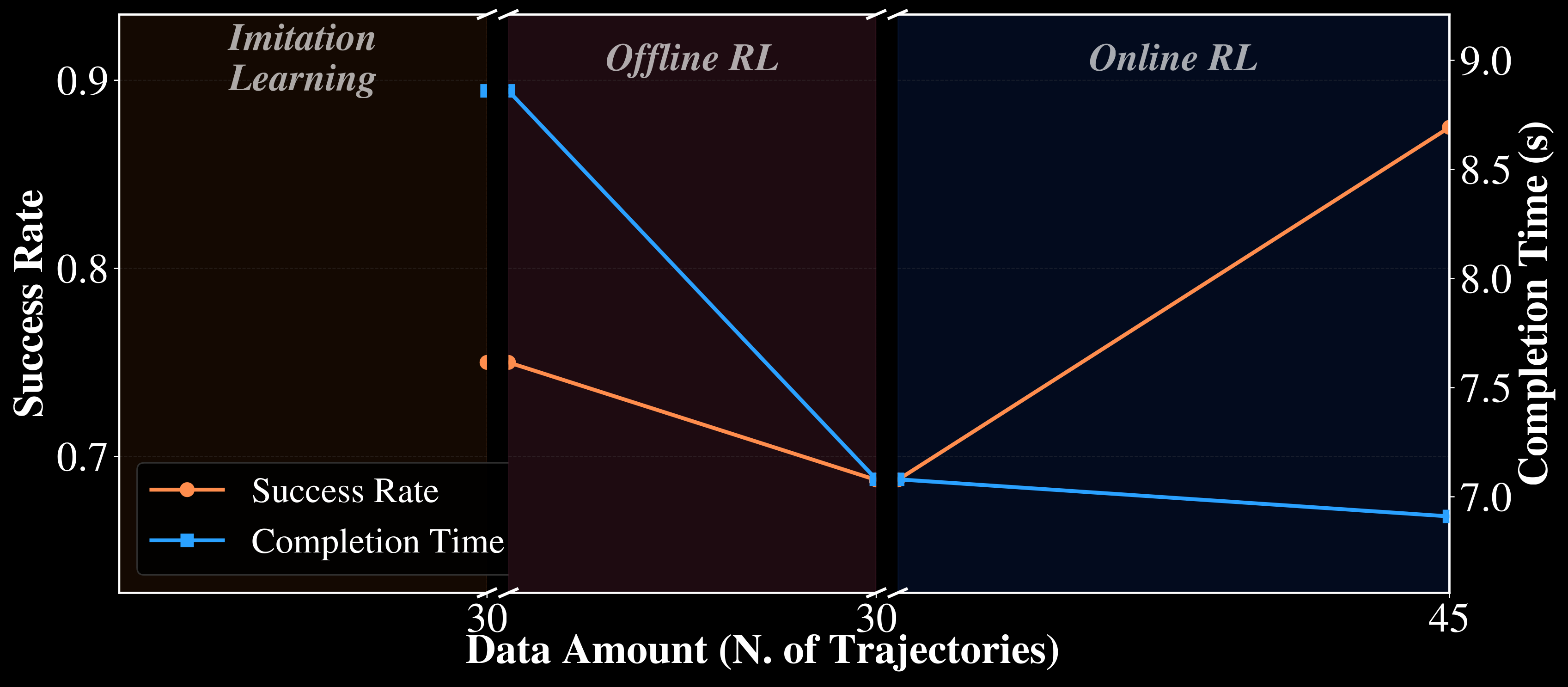 With only 30 teleoperated demonstrations, the duck task is a challenging low-data setting. Even under varying pickup locations and orientations, offline RL reaches 68.75% success, and subsequent online RL with just 15 additional rollouts improves this to 87.5%, compared with 75% after imitation learning. On the subset of rollouts where all three policies succeed, RL also speeds up execution: average completion time drops from 8.86s for imitation learning to 7.08s after offline RL and 6.91s after online RL.