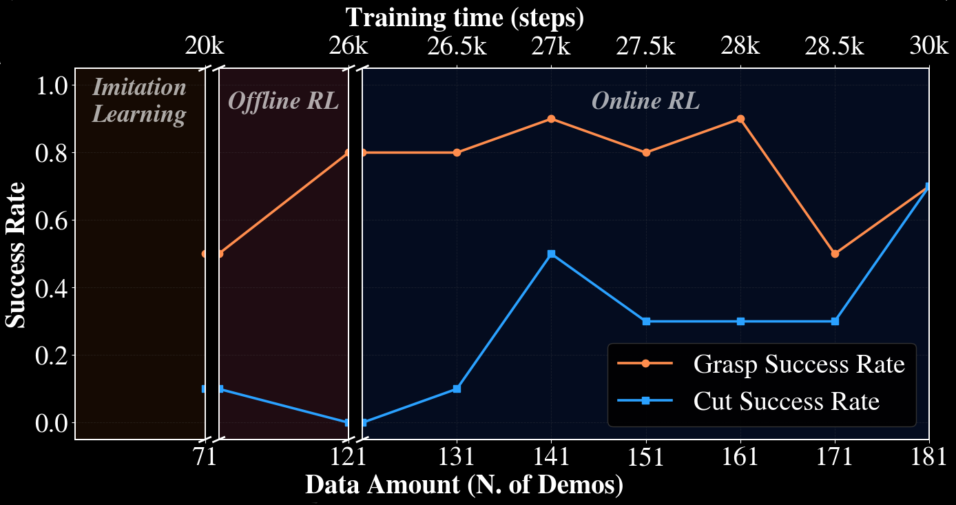 Starting from imitation learning, SOFT-FLOW improves grasping with offline RL and enables successful cutting after limited online fine-tuning. In the paper’s summary table, SOFT-FLOW reaches 70% grasp and 70% cutting success in the final setting.