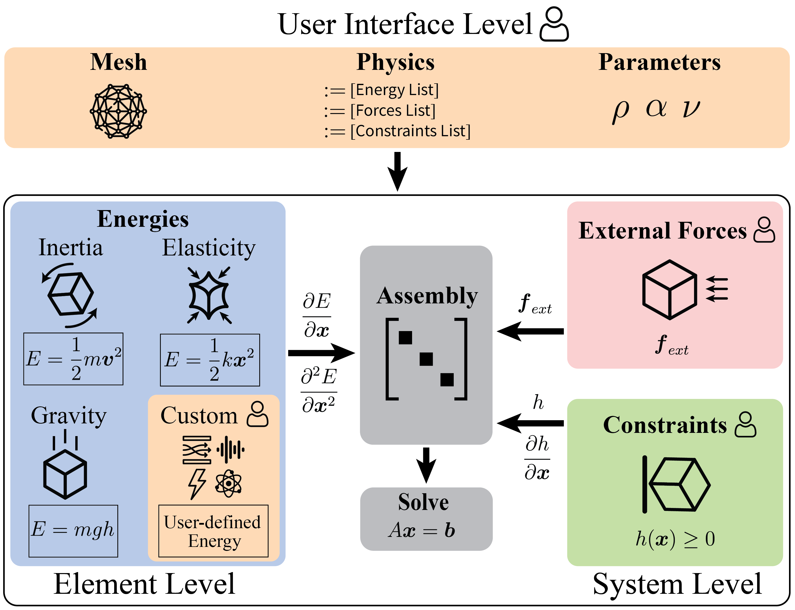 The framework decomposes physics into energies, forces, and constraints, enabling clear extension points without invasive changes to simulator internals.